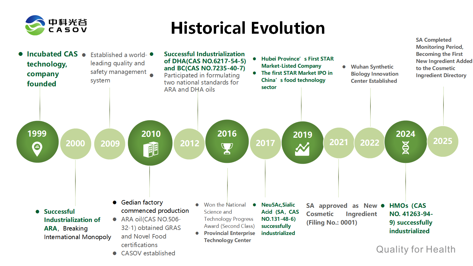 Wuhan CASOV Green Biotech Co., Ltd., eine hundertprozentige Tochtergesellschaft der an der STAR Market notierten CABIO Group (Börsenkürzel: 688089), nutzt die technologischen Ressourcen der Chinesischen Akademie der Wissenschaften und ein modernes F&E-System, um sich auf Biofermentation, die Entwicklung funktioneller Inhaltsstoffe und deren Anwendung zu konzentrieren. Das Unternehmen, das im Oktober 2014 als „Nationales High-Tech-Unternehmen“ anerkannt wurde, fungiert als Innovationszentrum für industrielle Technologie der Provinz Hubei und als Träger des Biologischen Züchtungszentrums der Chinesischen Akademie der Wissenschaften. Es pflegt eine enge Zusammenarbeit mit dem Forschungsteam der Hefei Institute of Physical Science der Chinesischen Akademie der Wissenschaften, um kontinuierliche technologische Innovationen voranzutreiben.